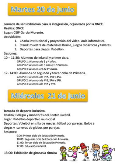 Del 19 al 22 del presente mes de junio, el CEIP García Morente va a celebrar su Semana Cultural que este año tendrá como lema, "EDUCAR PARA CONVIVIR". Las actividades programadas para la celebración de estas jornadas tendrán como principales objetivos: